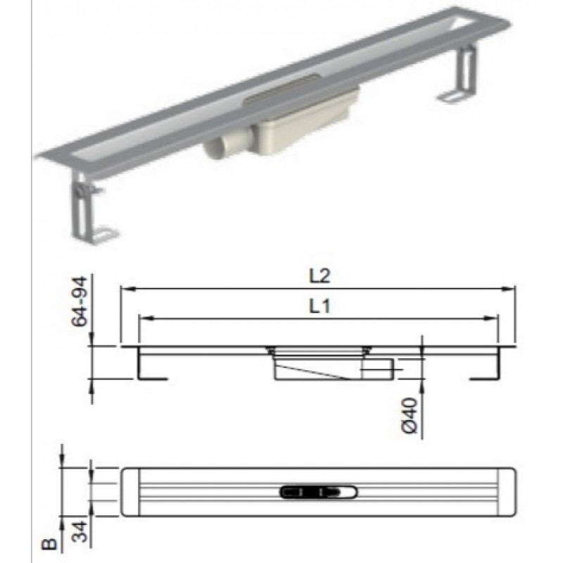 Inštalačná výška (po hornú hranu príruby): 64 mm / DN 40, vodná uzávera 34 mmRozmery L1 [mm] L2 [mm] B [mm]: 900 x 960 x 94