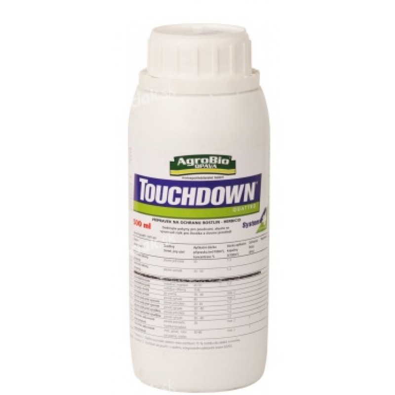 Totálny herbicíd na ničenie burín a nežiadúcej vegetácie.Touchdown QUATTRO obsahuje účinnú látku glyfosát, ktorá je prijímaná listami. Prípravok pôsobí nevýberovom ako listový systemický herbicíd proti širokému spektru jednoročných a viacročných burín vrátane pýru plazivého, pichliač roľný a mlieku roľného pred sejbou alebo výsadbou, pred zberom alebo na strnisko. V rastlinách sa rýchlo šíri. Po aplikácii na list aktívne rastúcich burín je Touchdown QUATTRO translokovaný do koreňov, stolony, rizómov, čo vedie k totálnemu zničeniu rastliny. Preto je dôležité, aby buriny dosiahli dostatočnú plochy povrchu listov, zaisťujúce vstrebanie prípravku. Optimálna doba pre aplikáciu proti vytrvalým burinám je tesne pred alebo na začiatku kvitnutia. Na dosiahnutie dostatočnej translokácie prípravku Touchdown QUATTRO do odnoží, je vždy potrebné počítať s kultiváciou najskôr týždeň po aplikácii. U väčšiny trvácich burín je potrebné počkať s kultiváciou minimálne 7 dní. Pri kontakte s pôdou sa inaktivuje.
