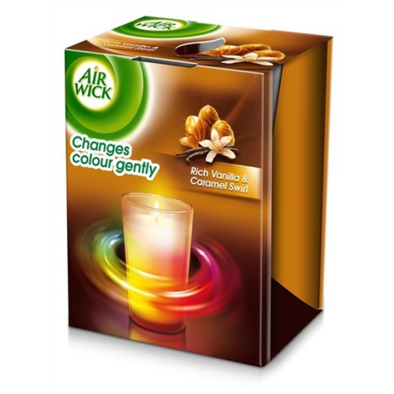 Air Wick sviečka Multicolor Vanilka a Karamelový sen 155 gAkonáhle sviečku zapálite, upokojujúce a príjemná žiara presvieti vosk pozvoľným prelievaním farieb, s podmanivým dúhovým efektom.