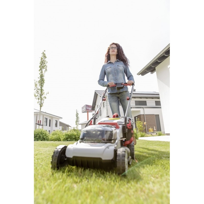 Vzhľadom na svoju nízku hmotnosť vďaka plastovému telesu a z nej vyplývajúcu vysokú obratnosť, ako aj vzhľadom na šírku záberu 34 cm je kosačka AL-KO Moweo 34.8 Li ideálna na údržbu malých záhrad. 20 Volt lítium-iónový akumulátor sa pritom postará o efektívnu prácu na trávnikoch s plochou do 200 m2. Akumulátor sa nabije za cca 150 min. Jediným pohybom ruky môžete pohodlne nastaviť výšku kosenia v 6 polohách od 25 mm do 75 mm. Veľký tkaninový zberný kôš s ukazovateľom stavu naplnenia má objem 45 l. Na ľahkú prepravu slúži účelný držiak a vďaka ergonomickému sklápaciemu držadlu s pogumovaným úchytom možno kosačku AL-KO Moweo 34.8 Li poskladať a priestorovo úsporne uskladniť.