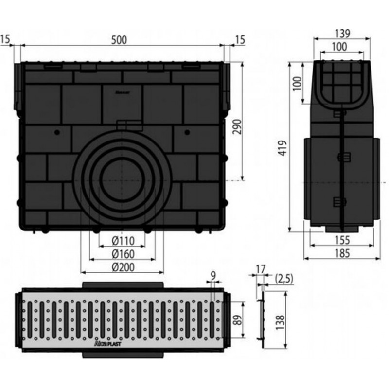 ALCAPLAST Venkovní žlabových vpusť bez rámu s pozinkovaným roštem "T" profilu A15 AVZ101R-R101Spoužití: