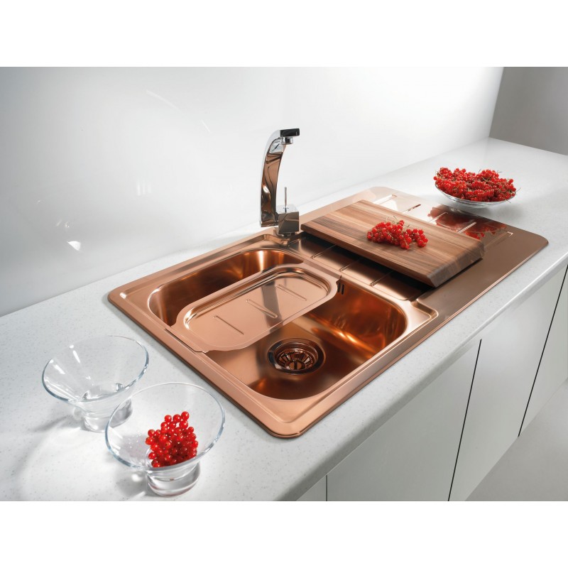 Radu drezov značky Alveus boli rozšírené o skupinu kuchynských drezov rady Monarch, ktorá je dostupná v troch rozdielnych nerezových prevedeniach. Vo vašej kuchyni sa môžu teraz žiarivo vynímať zlaté, medené a antracitovej varianty. Kovový lesk drezu dodá vašej kuchyni nádych mystiky a vďaka špeciálnej technológii akumulácie je každý drez unikátny. Atraktivitu a funkčnosť drezu umocňujú doplnky ako drevená doska na krájanie alebo nerezová miska.
