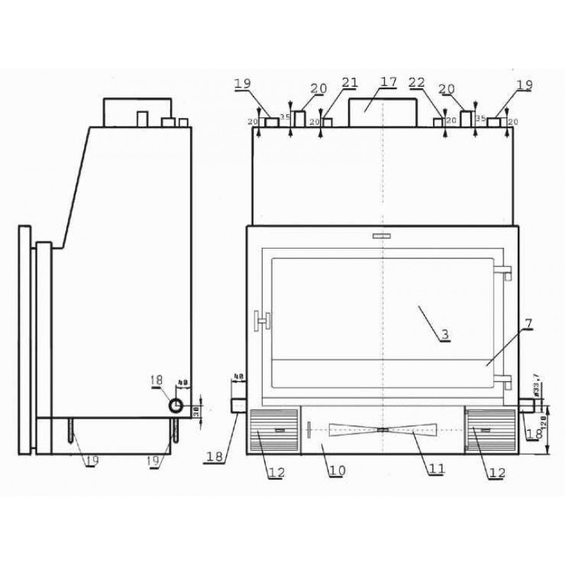 - Vzduch pre horenie môže byť z väčšej časti privedený z exteriéru pod krbovú vložku, kde sa nasadí na prírubu. Tá je štandardne súčasťou ponuky