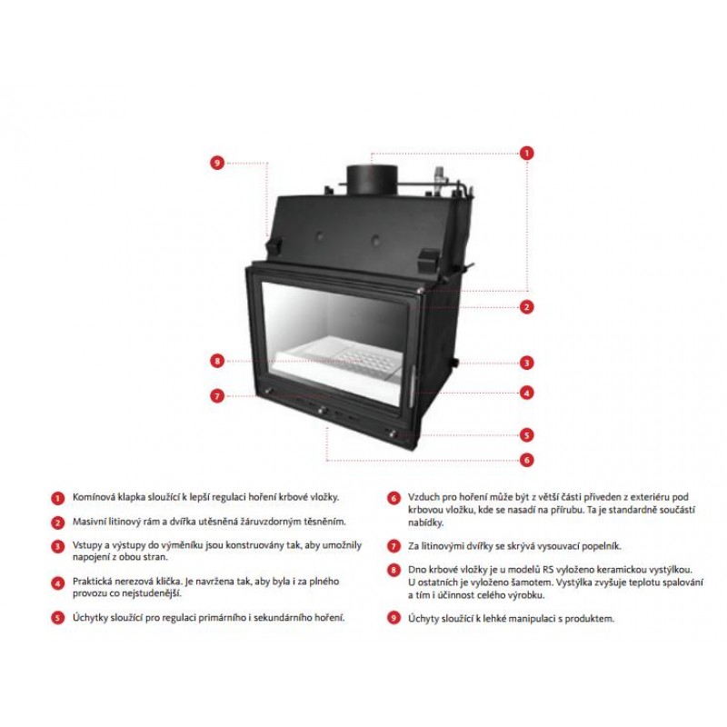 - Dno krbovej vložky je u modelov RS vyložené keramickou výstelkou. U ostatných je vyložený šamotom. Výstelka zvyšuje teplotu spaľovania a tým aj účinnosť celého výrobku