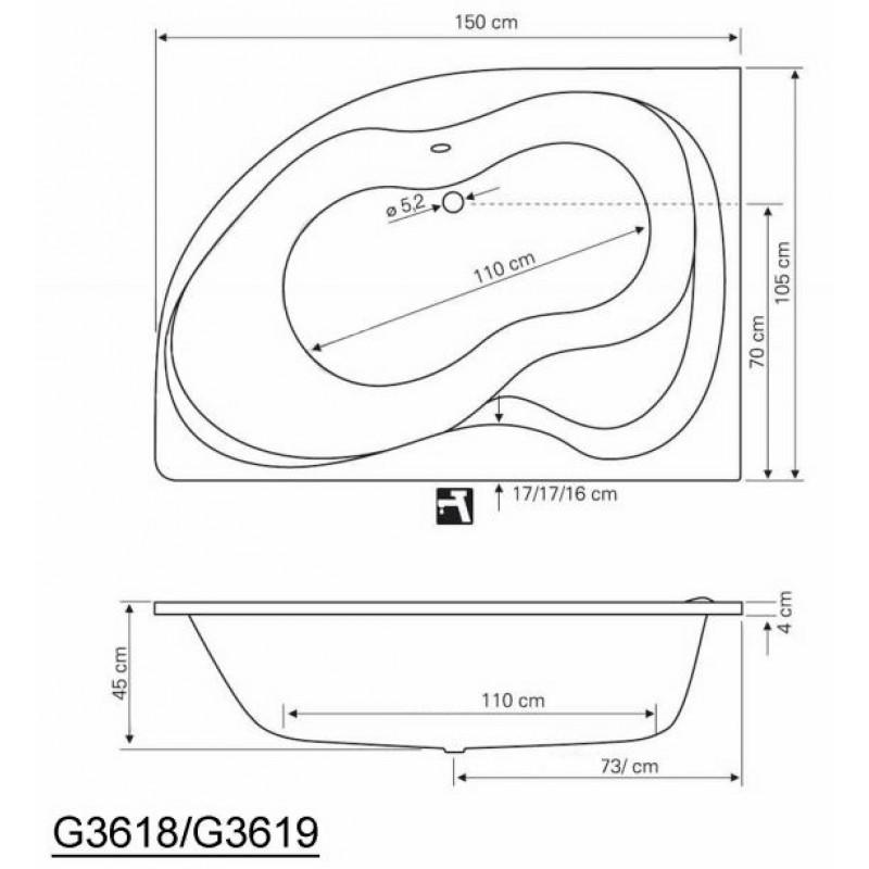 AQUALINE CIDLINA 150 vaňa, bez nožičiek, pravá, biela G3619Inštalácia Zapustenie do podlahy, Usadenie na podlahu, podmurovaním a obložením, S obkladovým panelom, Inštalácia do rohu.