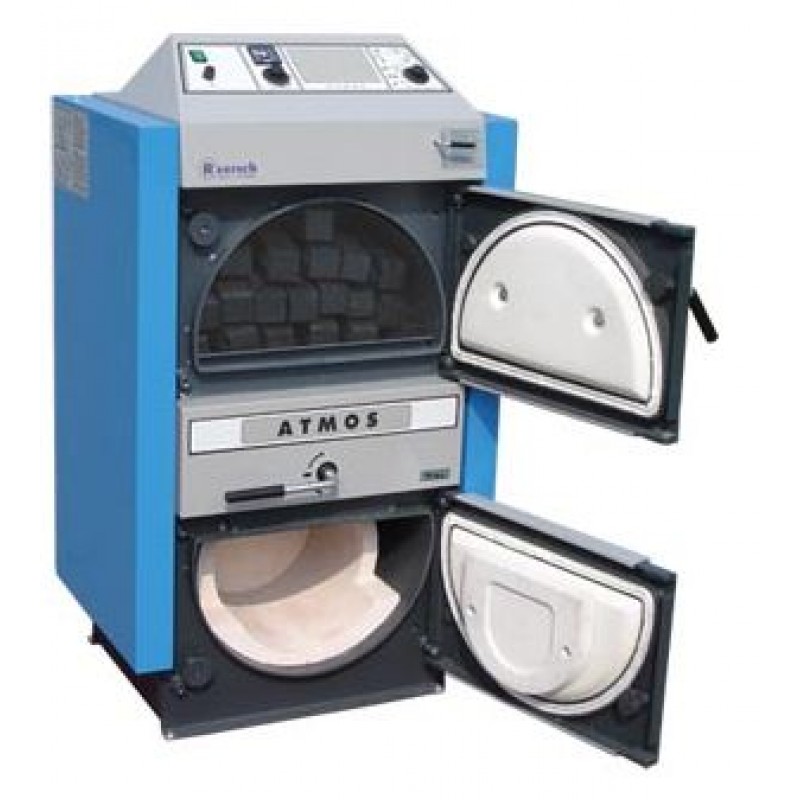 Ekologické teplovodné kotle ATMOS DC14R, DC24RS, DC30RS sú určené pre vykurovanie rodinných domov, chát, chalúp a iných obdobných objektov o tepelných stratách 15-32 kW. Kotly sú konštruované výlučne pre spaľovanie kvalitných drevených brikiet a kusového dreva. K kúrenie možno použiť akéhokoľvek suchého dreva, najmä drevných polien, štepov do max. Dĺžky 330 mm a kvalitných drevených brikiet s priemerom 75-100 mm a dĺžke 200 až 300 mm. Je možné použiť drevo aj o väčšom priemere vo forme klátov, zníži sa tým menovitý výkon, ale predĺži doba horenia. Kotol nie je určený pre spaľovanie hnedého a čierneho uhlia, pilín a drobného drevného odpadu. Ako náhradné palivo pre prípad núdze je možné použiť uhoľné brikety. Kotly svojou mohutnou násypkou umožňujú vkladanie celých balíkov brikiet a veľkých drevených klátov. * Kotly vybavené sacím ventilátorom* Predpísané palivo - DREVENÉ BRIKETY o 75 -100 mm, dĺžka 200 - 300 mm