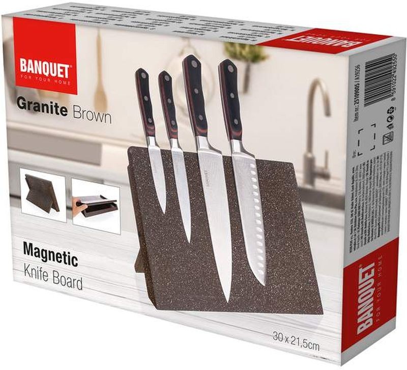 Magnetická doska na nože GRANITE BROWN s rozmermi 30 x 21,5 cm je praktický pomocník do každej kuchyne na prehľadné usporiadanie nožov. Vďaka nej budete mať nože neustále po ruke. Povrch dosky je z MDF v hnedej farbe s dekorom Granite Brown. Magnetická doska slúži ako stojan a umožní vám bezpečný a ľahký prístup k nožom. Pevné uchytenie nožov zaisťuje silný magnet vo vnútri dosky.