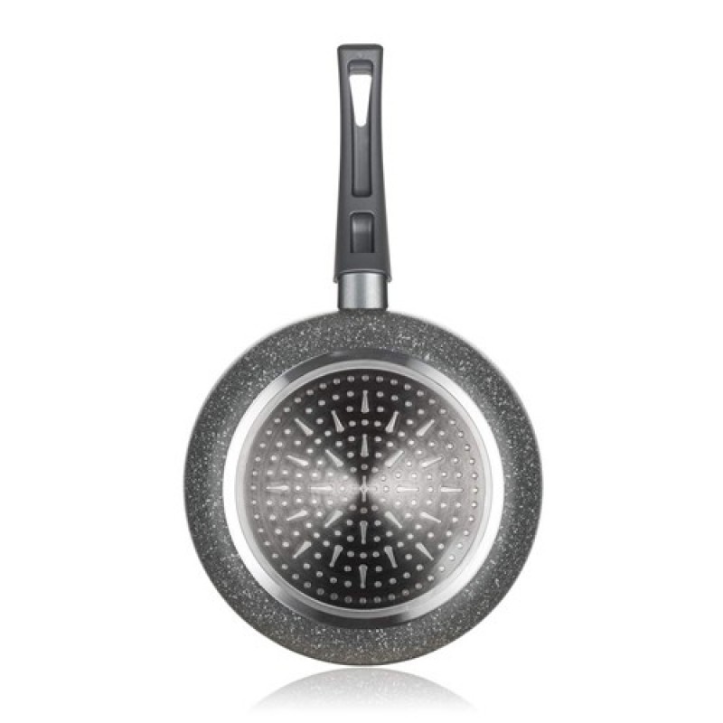 Hliníková lisovaná panvica GRANITE 24 x 5 cm s nepriľnavým 2-vrstvovým povrchom v granitovom dekore, šedú bakelitovou rukoväťou so soft-touchovou povrchovou úpravou a plne indukčným dnom.Výška (cm): 5
