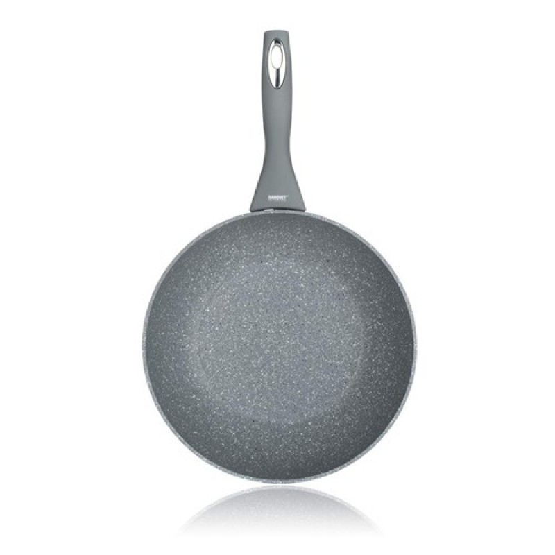 Hliníková liata kovaná panvica WOK GRANITE GREY s nepriľnavým povrchom 28x7,8 cm, šedý granitový dekor, hrúbka steny 3 mm, plne indukčné dno, soft-touch rukoväť. Nepriľnavý povrch je veľmi tvrdý a odolný proti poškriabaniu. Panvica je odolná proti nárazu a deformácii tvaru. Vysoká tepelná vodivosť zaisťuje rýchle a ekonomické varenie - dlho drží teplotu.Výška (cm): 7,8
