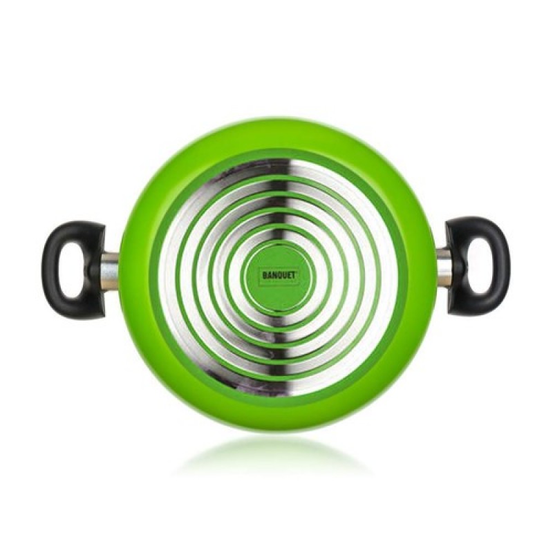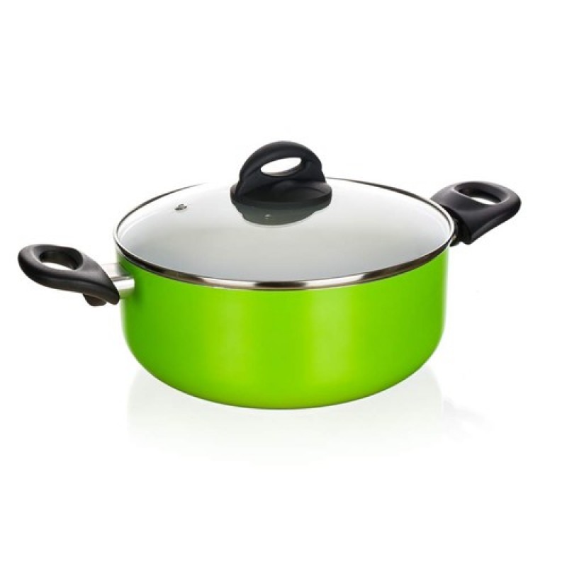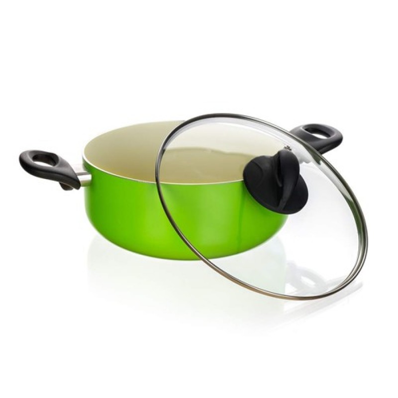 Hliníkový kastról 20 x 9 cm Natura Ceramia Green s vnútornou keramickou povrchovou úpravou, čiernymi bakelitovými úchytmi a sklenenou pokrievkou s čiernym bakelitovým knobom. Keramický povrch je na rozdiel od iných nepriľnavých povrchov viac odolný proti poškriabaniu a aj pri používaní vo vysokých teplotách je povrch trvalejší. To napomáha ľahšiemu vareniu a údržbe.Na varenie používajte drevené alebo plastové náčinie, aby nedošlok poškriabaniu. Pozor: časté umývanie v umývačke za použitia dlhých programov a agresívnych umývacích prostriedkov môže spôsobiť neodstrániteľné zmeny na vnútornom aj vonkajšom povrchu.