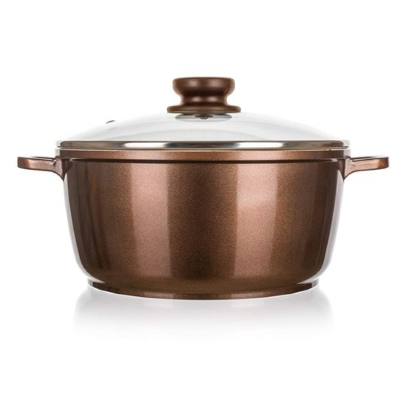 Hrniec so skleneným vekom TITUS, hliníkový liaty hrniec s priemerom 16 cm s nepriľnavým krémovým povrchom, hnedá farba, hrúbka steny 2 mm, hrúbka dna 4,2 mm, možno umývať v umývačke riadu na šetrné programy. Pre zapekanie v rúre používajte iba hrniec bez pokrievky, ktorá na to nie je určená!Výška (cm): 7,5