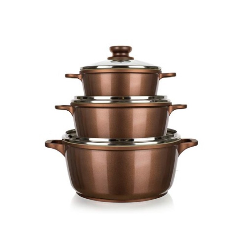 Sada hliníkových hrncov so sklenenou pokrievkou 3ks 16 + 20 + 24 cm TITUS, nepriľnavý keramický krémový povrch, hnedá farba. hrúbka steny 2 mm, hrúbka dna 4,2 mm, možno umývať v umývačke riadu na šetrné programy. Pre zapekanie v rúre používajte iba hrniec bez pokrievky, ktorá na to nie je určená!Priemer (cm): 16, 20, 24