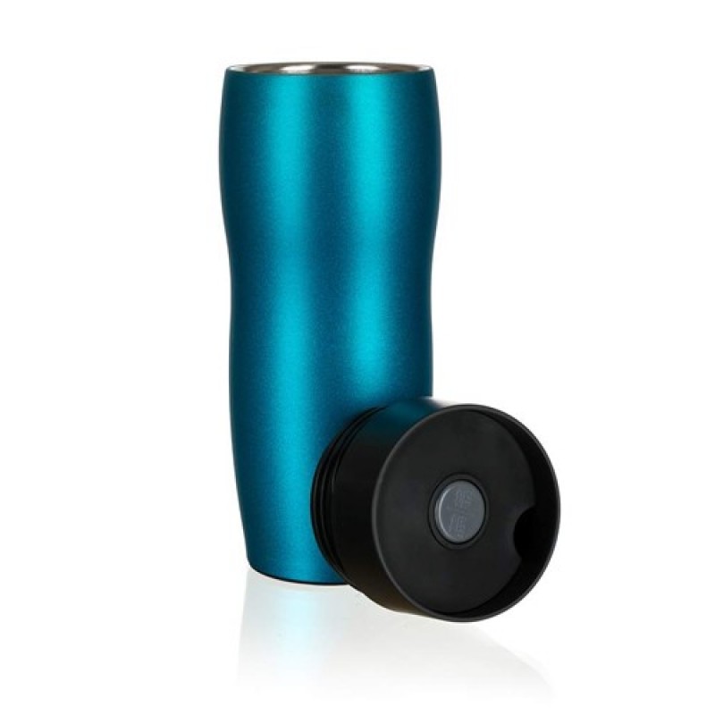 Termohrnček cestovný 320 ml TRAVELER, tyrkysová farba, vonkajší povrch nerez 14/1 (201), vnútorný povrch nerez 18/8 (304), plast PP (polypropylén) .Telo hrnčeka je vákuové, udrží nápoje dlhšie horúce či studené, viečko je nepriepustné .Objem (ml): 320