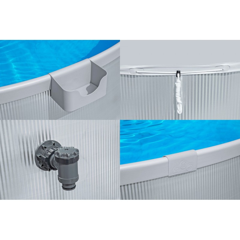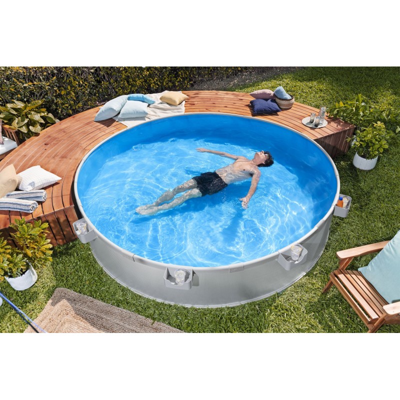 Pozinkované oceľové steny zaručujú dlhú životnosť a odolnosť proti korózii, zatiaľ čo polstrovaný PVC plášť s UV ochranou poskytuje pohodlie a bezpečnosť. Štyri posuvné držiaky na nápoje premenia bazén na súkromnú vodnú lounge, ideálnu pre rodinu a priateľov.