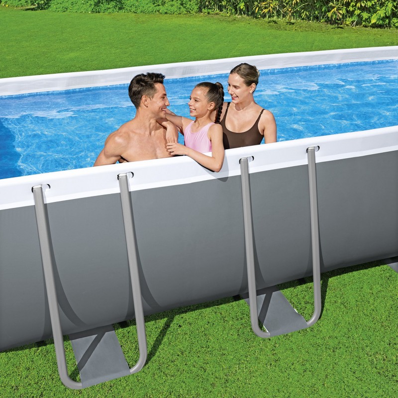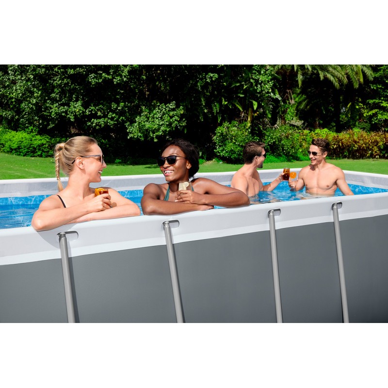 Obdĺžnikový nadzemný bazén Power Steel značky Bestway na povrchovú montáž. Pevné steny bazéna sú skonštruované z materiálu Tritech™, ktorý sa skladá z jadra z polyesterovej sieťoviny, okolo ktorého sú dve vrstvy vysoko odolného PVC.