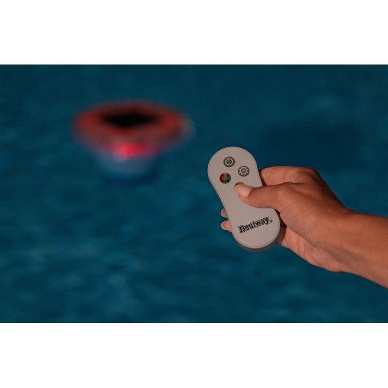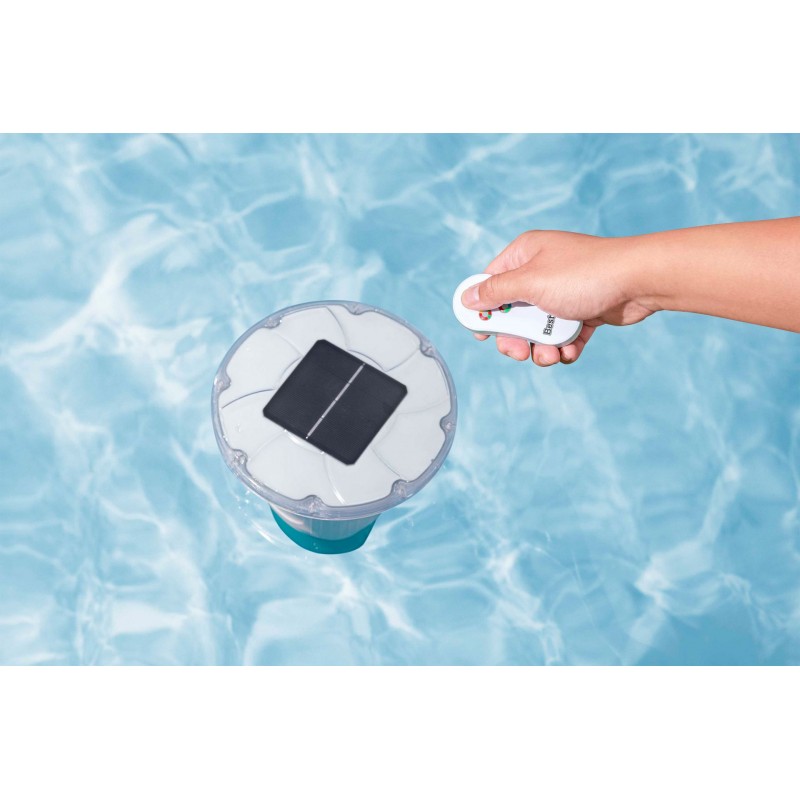 Plovák se solárním napájením automaticky rozsvítí po setmění a nabízí fascinující čtyřbarevné osvětlení s 3 světelnými efekty a 9 barevnými variantami (4 stálé a 5 kombinací). Díky vodotěsnému dálkovému ovládání můžete měnit režimy osvětlení až na vzdálenost 15 m. Solární akumulátor se nabíjí 7–10 hodin v závislosti na počasí a poskytuje světlo po dobu 6–8 hodin.