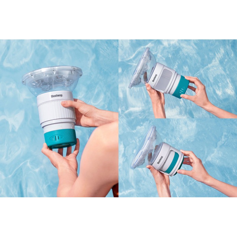 BESTWAY SolarGlow™ Dávkovací plovák ⌀ 18 × 21,5 cm promění Váš bazén v okouzlující noční atrakci a zároveň zajistí jednoduchou a efektivní péči o vodu. Tento inovativní plovák kombinuje dávkování chloru či bromu během dne s magickým LED osvětlením v noci, aniž byste museli přidávat další úsilí.