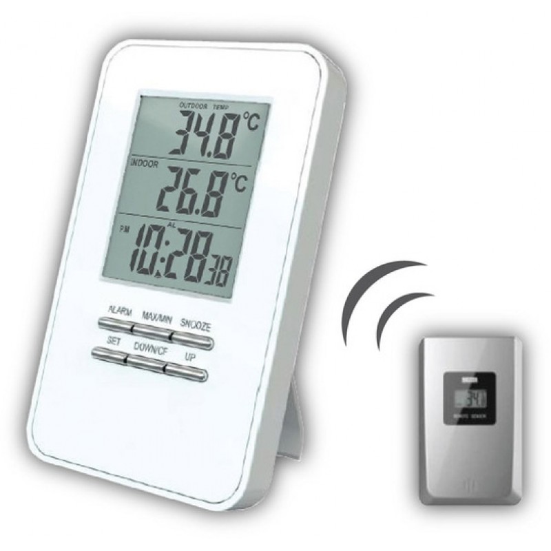 Bezdrôtový teplomer, teplota, čas, budík - bielyBezdrôtový teplomer, teplota, čas, budík, biely - meranie vnútornej teploty: -9 ° C až +50 ° C - meranie vonkajšej teploty: -50 ° C až +70 ° C - pamäť minimálnych a maximálnych teplôt - 1 bezdrôtový senzor (súčasťou balenie) - čas, budík - napájanie: hlavná jednotka: 2 x AAA (LR03) batérie (nie je súčasťou balenia) senzor: 2 x AAA (LR03) batérie (nie je súčasťou balenia) - farba: biela