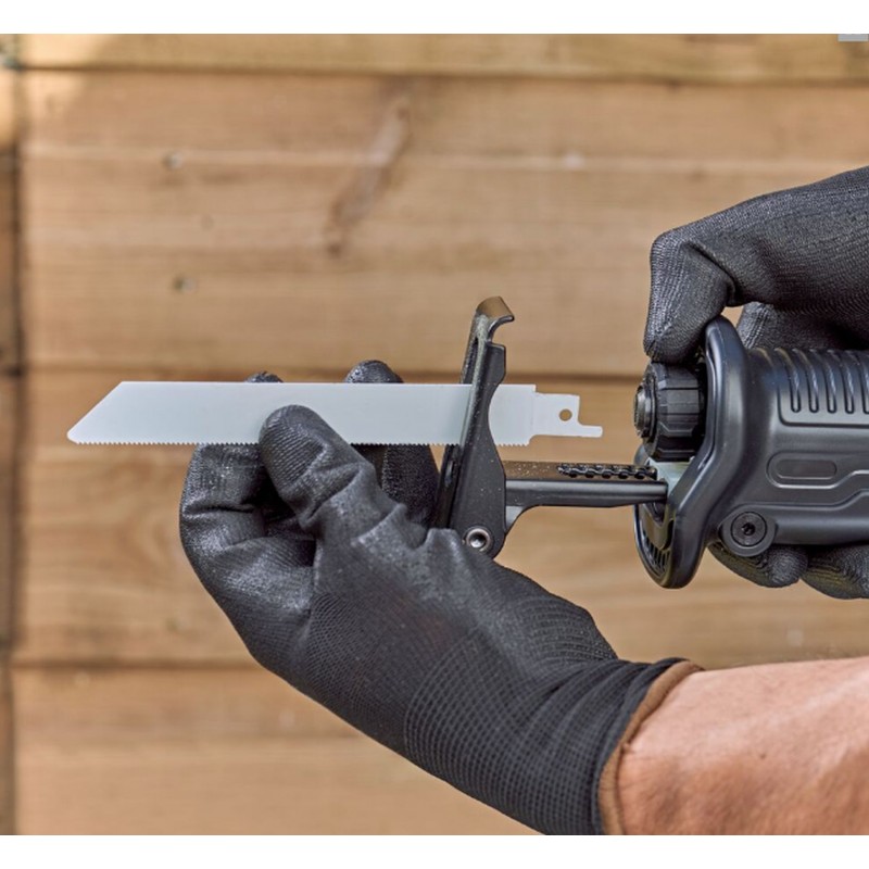 • Výmena čepele bez použitia nástrojov umožňuje rýchle a bezproblémové prehodenie čepele medzi aplikáciami. Táto píla je dodávaná s 2 pílovými plátkami a držiakom na vetvy.