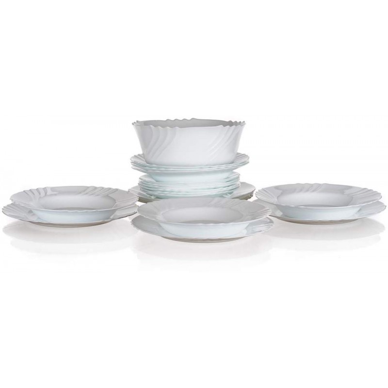 19-dielna sklenená sada EBRO obsahuje: 6 x dezertný tanier o priemere 20 cm, 6 x plytký tanier o priemere 25,5 cm, 6 x hlboký tanier o priemere 23,5 cm a 1 x misa s priemerom 23 cm. Všetko je odolné voči tepelnému šoku, vhodné do umývačky a mikrovlnnej rúry.parametre: