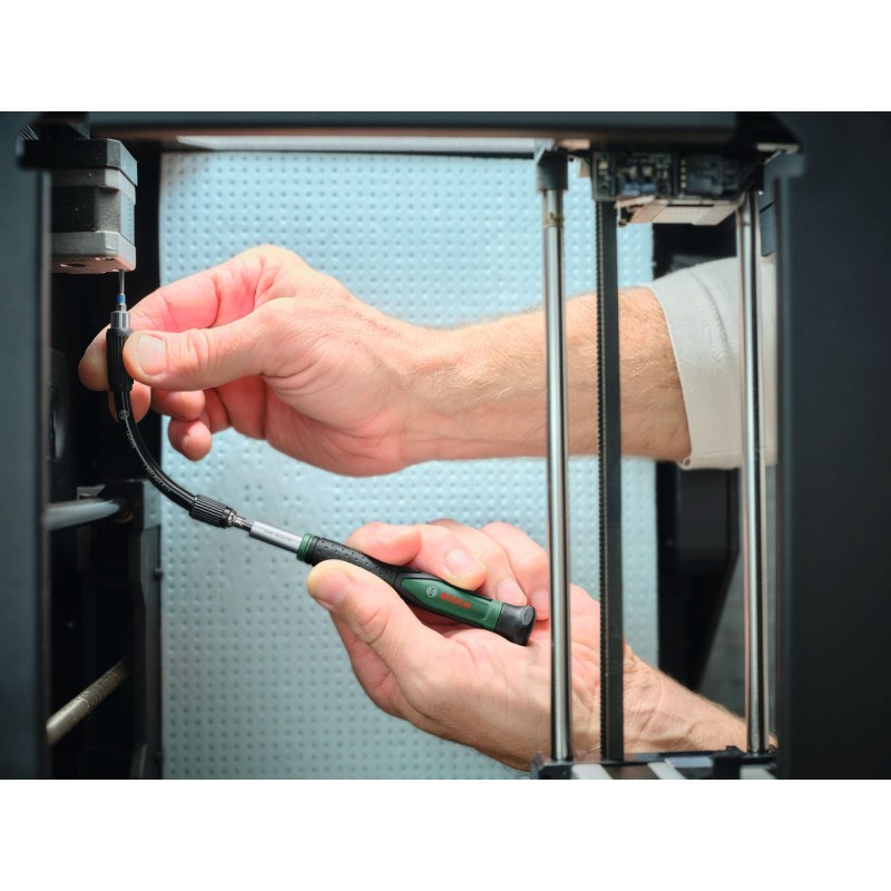 Rýchla a efektívna oprava drobných elektronických zariadení, okuliarov, notebookov alebo hodín vďaka vysokokvalitnej 20-dielnej súprave presného skrutkovača Bosch. Presný bitový skrutkovač sa vyznačuje štíhlym a ergonomickým dizajnom s mäkkou rukoväťou a otočnou hlavicou pre lepšiu manipuláciu a vyšší komfort. Umožní sa tak jednoduché a rýchle otáčanie a zároveň poskytne optimálnu silu na kontrolované a presné skrutkovanie. Skrutkovacie hroty zostávajú pevne na mieste vďaka silnému magnetickému držiaku skrutkovacích hrotov v stopke. Zakotúľaniu zabráni šesťhranný koniec rukoväti. Súprava obsahuje 20 presných bitov (PH000/00/0, SL1,5/2/2,5, TX2/3/4/5/6, TH8, HEX1,5/2, U2,6, Y1, päťhviezdicové 0,8/1,2, trojuholníkové 2/2,3), rovné predĺženie drieku, ohybné predĺženie drieku a praktickú pinzetu na jemné uchopenie. Je uložená v praktickom plastovom puzdre na jednoduché skladovanie a prepravu.