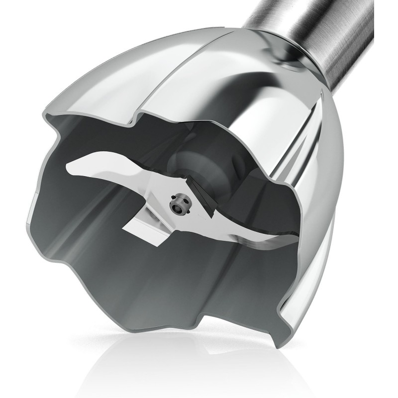 • Špeciálne prehnutý tvar mixovacej nohy poskytuje množstvo výhod: igrediencie sú unášané priamo na nôž QuattroBlade Pro so štyrmi ostrými hranami a mixovanie je ešte efektívnejšie.