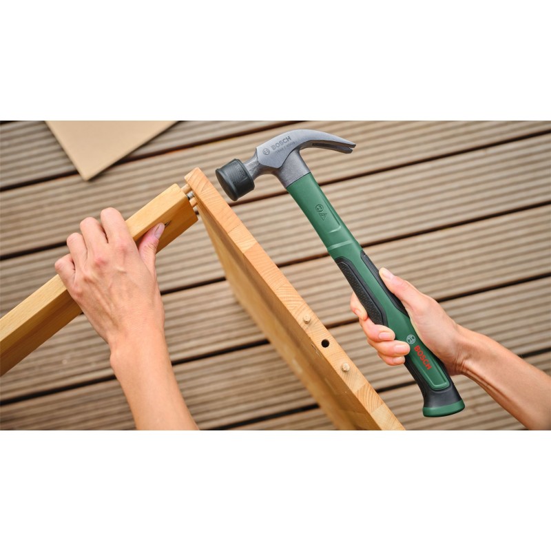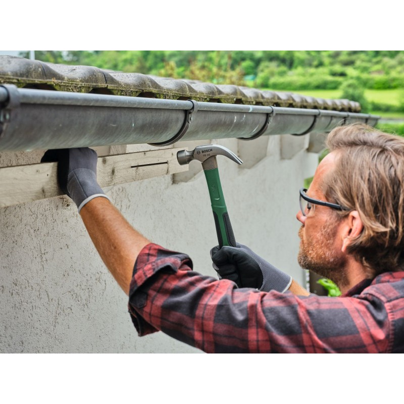 Pridajte si tesárske kladivo Bosch 450 g (16 oz) do súpravy dielenského náradia na silné a všestranné používanie v kategórii DIY. Toto univerzálne náradie je vynikajúcim spoločníkom pri zatĺkaní alebo vyťahovaní klincov pri rozoberaní drevených konštrukcií. Toto kladivo je vyrobené z tvrdej uhlíkovej ocele (50-58 HRC) a zosilnené sklolaminátovým jadrom a poskytuje silnú a presnú úderovú silu s minimom vibrácií. Matovaná úprava hlavy zvyšuje ochranu proti hrdzi a podporuje dlhú životnosť. Na ľahké vyberanie uviaznutých klincov je vybavené zahnutým špicom s drážkou tvaru V. Každú prácu zvládnete komfortne a s prehľadom vďaka ergonomickej rukoväti s dynamickým dizajnom mäkkého úchopu a vyváženej hlave.