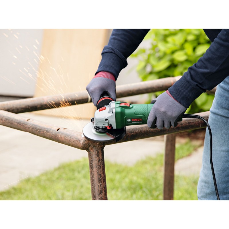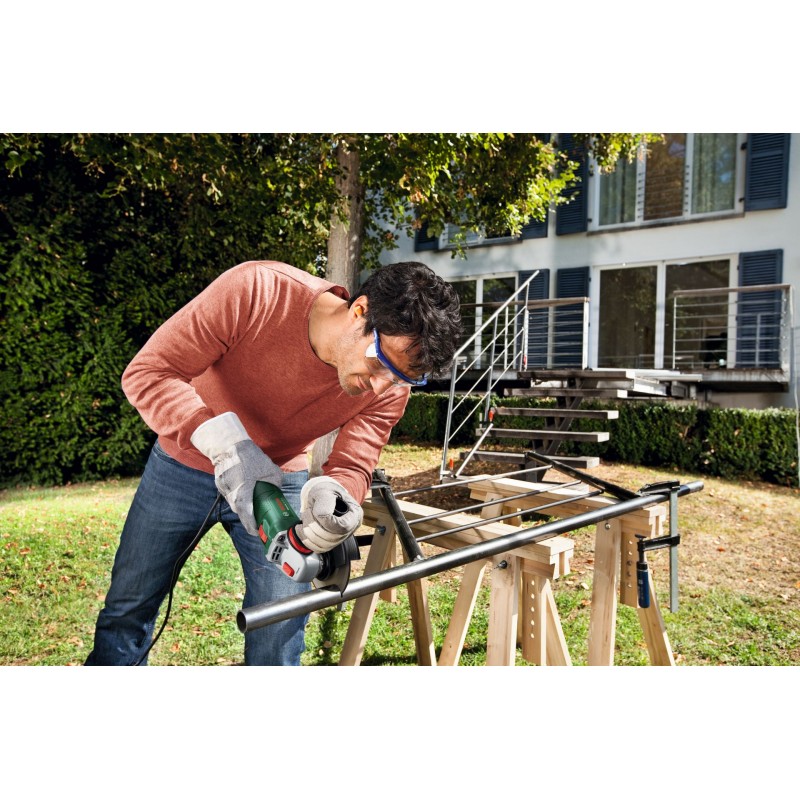Táto uhlová brúska kombinuje výkon a ľahké používanie a je ideálna na efektívne stredne veľké až veľké práce v kategórii DIY. Ergonomická konštrukcia, nízka hmotnosť, štíhle telo a minimálne vibrácie zaručujú komfortnú prácu, a to aj pri dlhodobom používaní. Výkonný motor triedy 850 W. Náradie je navrhnuté na obrusovanie, rezanie a kefovanie kovu, kameňa, betónových blokov a obkladačiek. Náradie je takisto vybavené rýchlonastaviteľným ochranným krytom, ktorý chráni pred iskrami pri práci.