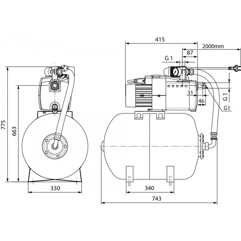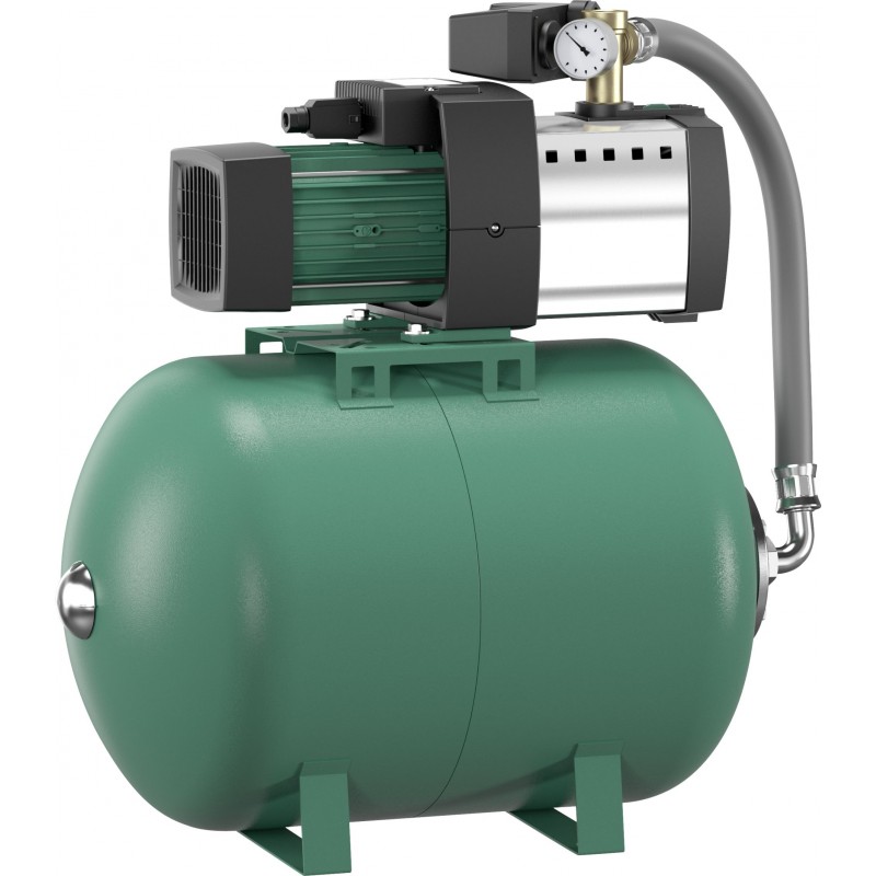 Systém obsahuje membránovú tlakovú nádobu s robustnou vymeniteľnou membránou EPDM, ktorá zabezpečuje stabilný tlak a dlhú životnosť. Súčasťou je tlakový spínač, manometer, flexibilná tlaková hadica a elektrická rýchlospojka. Motor má ochranu proti preťaženiu s automatickým resetom.