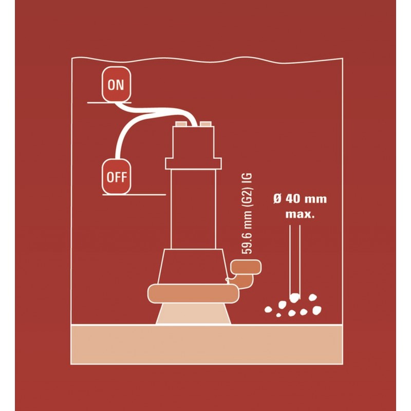 Plynule výškovo nastaviteľný plavákový spínač umožňuje výber medzi nepretržitou prevádzkou a prednastavenou výškou hladiny pre zapnutie a vypnutie čerpadla. Hadicová prípojka G2 je určená pre 2" hadice (cca 50,8 mm). Praktická rukoväť umožňuje pohodlný prenos kalového čerpadla.