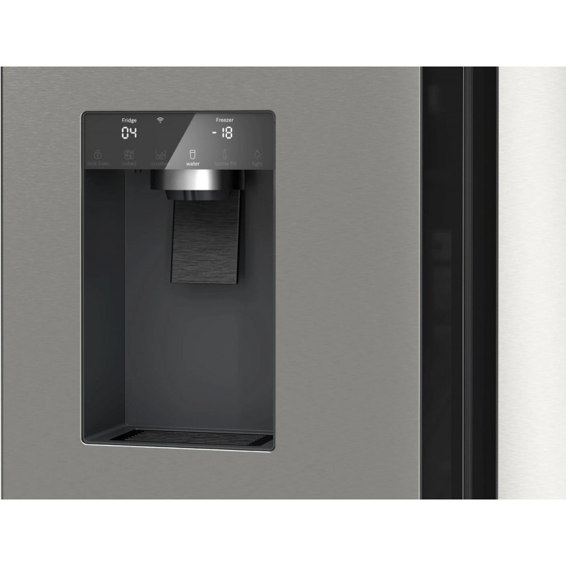 Integrovaný výdajník s pripojením na vodovod umožňuje dávkovanie kociek ľadu, drveného ľadu aj chladenej filtrovanej vody bez dopĺňania zásobníka. Systém dokáže vyprodukovať až 5 kg ľadu denne a ponúka funkciu hands-free plnenia fliaš s prednastaveným množstvom.