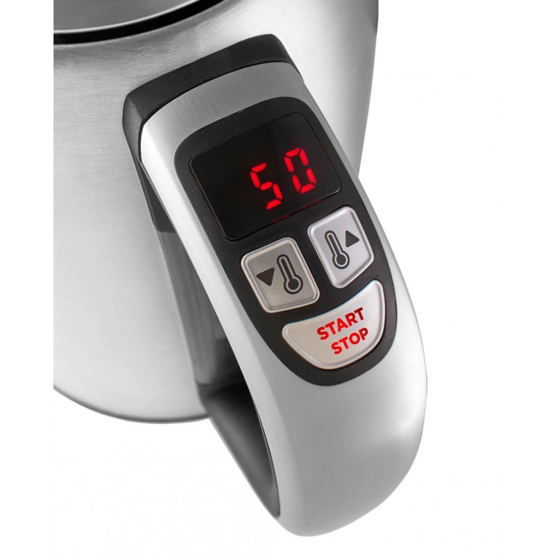 Kanvica RK3182 sa môže pochváliť dokonalým prevedením elegantného lesklého nerezu v inovatívnom dizajne. Vďaka objemu 1,7 l môžete pohodlne uvariť kávu aj pre viac kamarátok naraz. Hlavnou prednosťou je možnosť nastavenia teplôt. Konvička ponúka teplotu už od 50 ° C až do 100 ° C. Navyše teplotu môžete nastaviť po 5 ° C krokoch. Ďalej Vás potom poteší funkcia udržiavania teploty vody Keep Warm.