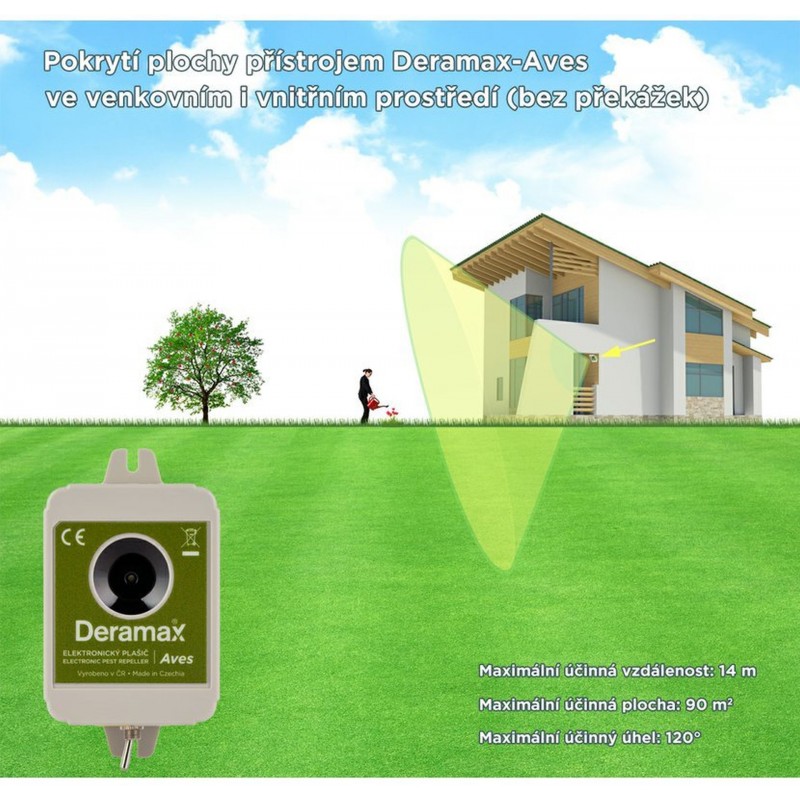 Deramax AVES je elektronické zariadenie, ktoré slúži na ochranu vnútorných alebo vonkajších priestorov pred netopiermi. Plašič Deramax generuje silné ultrazvukové pulzy špecifického tvaru, ktoré sú pre vtáky veľmi nepríjemné, takže po krátkom čase chránený priestor opúšťa. Škodcovia nie sú prístrojom usmrtení ani poranení, nedochádza teda k ich úhynu a nevzniká nutnosť odstraňovať uhynuté zvieratá. Prevádzka prístroja je ekologický, úplne bez chemických prostriedkov.