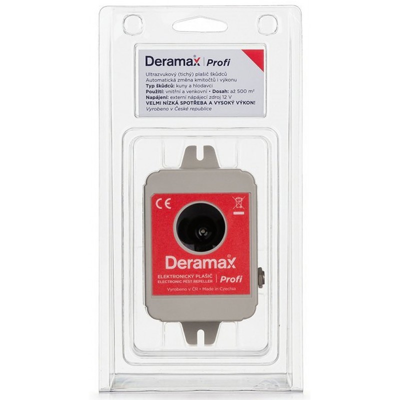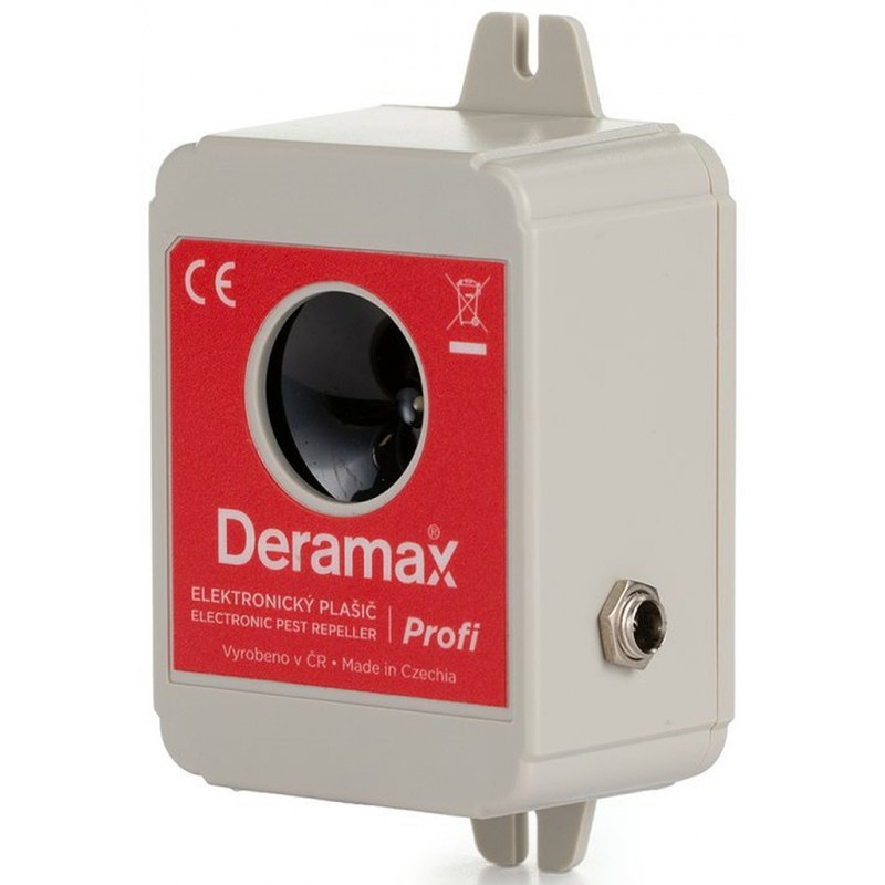 Ultrazvukový plašič (odpudzovač) Deramax-Profi je elektronické zariadenie, ktoré slúži na ochranu vnútorných alebo vonkajších priestorov pred kunami, hlodavcami a rejska. Prístroj je úplne bezpečný a bezhlučná ako pre človeka, tak aj pre bežné domáce a hospodárske zvieratá a umožňuje tak bezproblémové využitie aj v obytných priestoroch. Škodcovia sú trvalo obťažované ultrazvukovými signály plašiča a v krátkom čase opúšťa chránený priestor. Nedochádza teda k úhynu škodcov a nevzniká nutnosť odstraňovať uhynuté zvieratá. Prevádzka prístroja je úplne ekologický, bez využitia chemických prostriedkov.Vzhľadom k vysokému výkonu je plašič Deramax-Profi univerzálnym zariadením s možnosťou využitia ako pre ochranu malých obytných priestorov, tak aj rozsiahlejších komerčných priestorov. Využitie ultrazvukových Plašič kún a myší je dnes úplne bežnou metódou ochrany ako pre rodinné domy, byty, chaty, chalupy, tak aj pre komerčné priestory ako sklady, dielne, kancelárie, výrobne potravín, kuchyne, reštaurácie apod. Ultrazvukový plašič Deramax-Profi teda ochráni nielen vašu pôdu, pivnica, alebo obytnú časť domu, ale tento typ plašiča využívajú napr. aj obchodné reťazce s potravinami a pod.