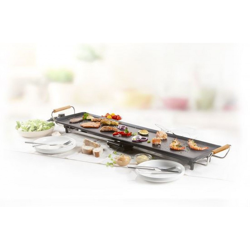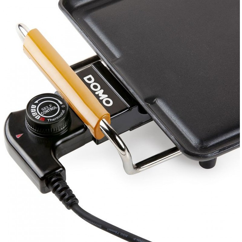 Extra veľký elektrický stolný gril DOMO vyrobený z tlakovo liateho hliníka o sile 4 mm zaisťujúcim vysokú pevnosť dosky na pečenie. Vykurovacie teleso zaliate priamo do dosky na pečenie umožňuje maximálny prenos tepla do dosky na pečenie a kvalitný nepriľnavý povrch vám uľahčí čistenie a umožní grilovanie bez použitia tuku. Prebytočný vypečený tuk odchádza otvorom do zbernej nádobky pod doskou na pečenie. Po grilovaní stačí plochu iba ľahko zotrieť a máte upratané.