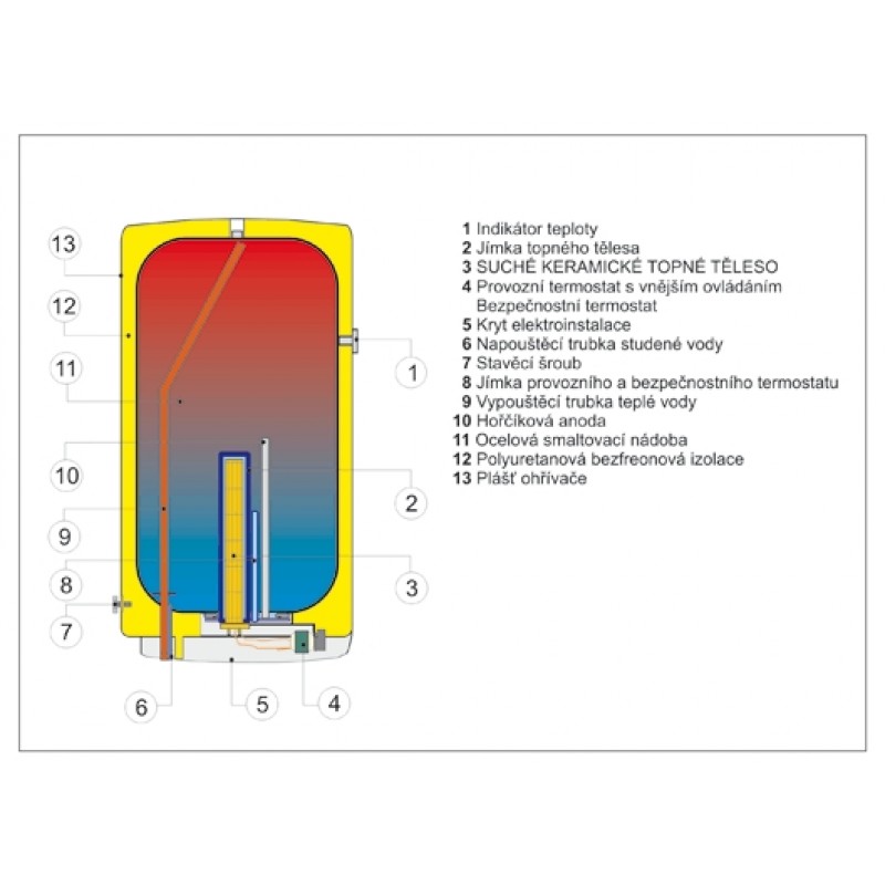 Elektrický akumulačný ohrievač, určený pre zavesenie na stenu, s objemom 100 litrov. Ohrev zaisťuje keramické výhrevné teleso, ovládané prevádzkovým termostatom a istené bezpečnostným termostatom (tepelnou poistkou). Teplotný rozsah 5-74 ° C. Pripojovacie napätie 3 PE-N ~ 400 V/50 Hz. Elektrické krytie IP 45 umožňuje umiestnenie ohrievača do zóny 1 podľa STN 33 2000-7-701.