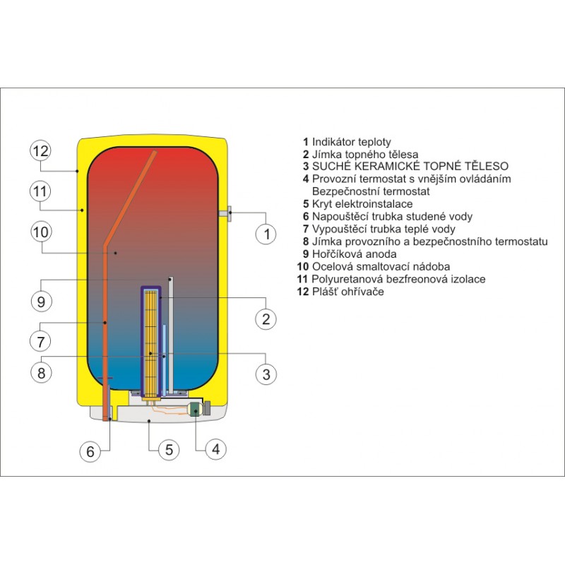 Ohrev zaisťuje keramické výhrevné teleso ovládané prevádzkovým termostatom a istené bezpečnostným termostatom (tepelnou poistkou). Teplotný rozsah 5-74 ° C. Pripojovacie napätie 1-PE-N/AC 230 V/50 Hz. Elektrické krytie IP 45 umožňuje umiestnenie ohrievača do zóny 1 podľa STN 33 2000-7-701.