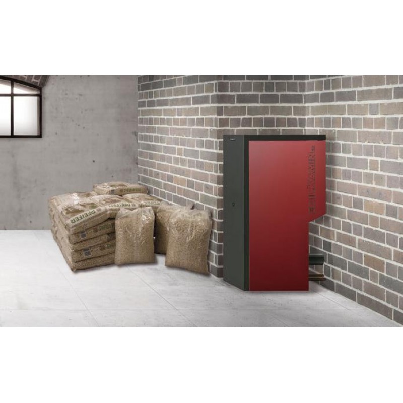 Kotol na pelety stredného výkonu , ktorý zásobuje vykurovací systém s radiátormi a podlahovým vykurovaním . Oceľová konštrukcia , zásobník na pelety 55 kg , dvojitá izolácia dvierok . Môže byť napojený na solárne panely a alebo na plynový kotol . KIT centrála DOMOKLIMA a pneumatický dopravník peliet za príplatok .