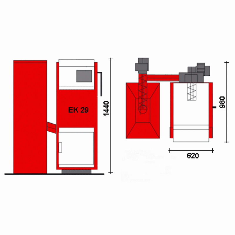 EDILKAMIN EK 29 kotol na pelety s oceľovou konštrukciou s dvoma motormi (1 a 2) 631810Kotol na pelety EK 29 je určený na vykurovanie objektu prostredníctvom teplej vody vyrábané vo výmenníku ohniska, odkiaľ je pomocou čerpadla odvádzaná do jednotlivých radiátorov v celom dome. Výkon výmenníka kotla je max 17 kw. Ku kotlu je možné doobjednať zásobníky s obsahom 100, 400, 700 litrov, alebo textilné silá s obsahom 1, 3, 4,5 tony.