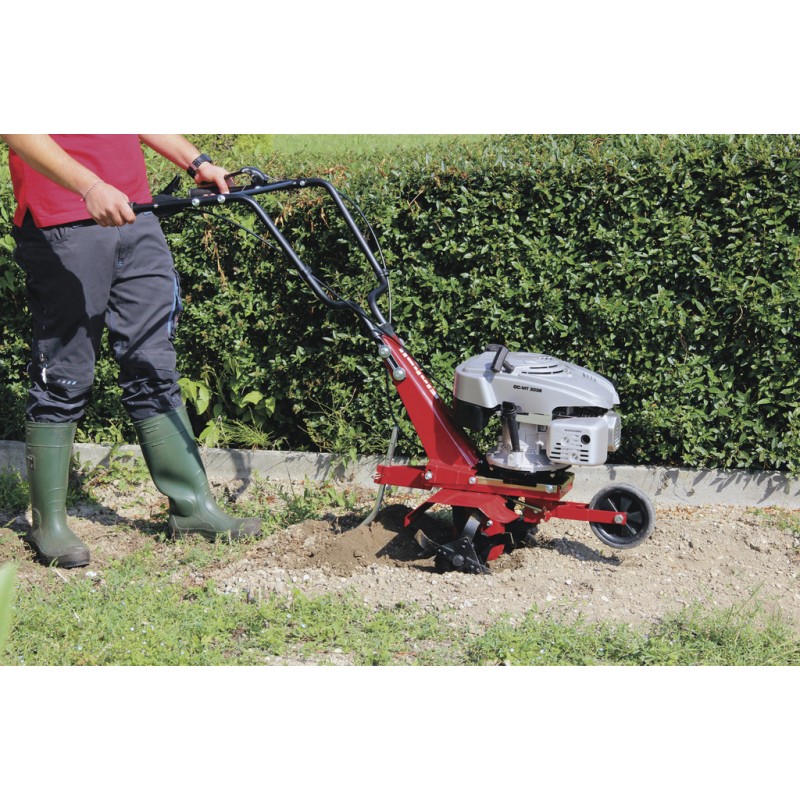Benzínový kultivátor GC-MT 3036 predstavuje praktický a výkonný záhradný stroj pre efektívnu kultiváciu pôdy. Vysoký výkon a hladký chod zabezpečuje jednovalcový štvortaktný motor, ktorý je vybavený bilaterálnym uložením kľukového hriadeľa. Robustné kultivačné čepele garantujú rýchly postup aj v pevnej pôde. Pracovný hĺbku je možné upraviť vďaka výškovo nastaviteľnej brzdnej čeľuste. Pre vyššiu bezpečnosť je kultivátor vybavený poistkou mŕtveho muža, ktorá zastaví čepele akonáhle je uvoľnený vypínač. Otočné vodiace koleso slúži ľahkej manipulácii a presunu z miesta na miesto. Kultivátor je možné prispôsobiť užívateľovi a to vďaka ergonomickej a výškovo nastaviteľnej rukoväte.