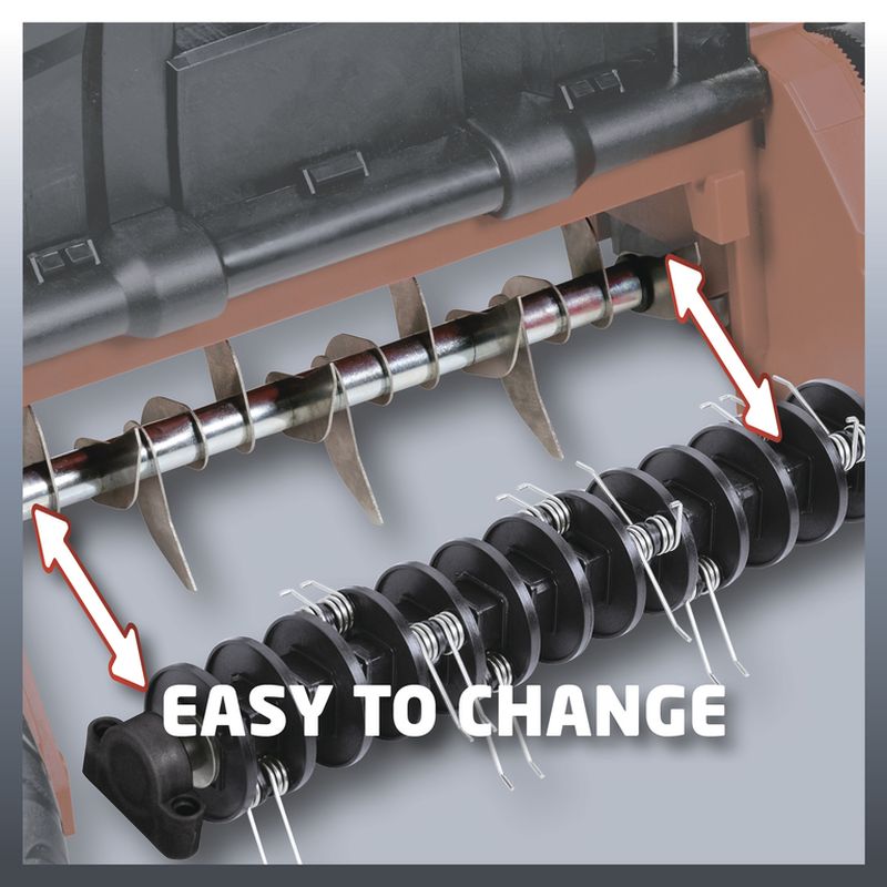 Aku vertikulátor výkonný a spoľahlivý záhradný pomocník, ktorý pomáha vlastníkom rodinných domov, chát a záhradiek s úpravou malých až stredných veľkých trávnikov. 16 vysoko kvalitných hrotov guličkovými ložiskami dôkladne odstráni burinu a mach aj s koreňmi. Výkonný bezuhlíkový motor Einhell, vyžadujúci dve nabíjacie 18 V batérie rady Power X-Change, vytvára vďaka 36 V vysoký krútiaci moment. Plynulý postup práce pre výborné výsledky. Výšku rukoväti je možné ľahko a rýchlo prispôsobiť užívateľovi v troch rôznych pozíciách. Vertikulátor je možné prispôsobiť nielen užívateľmi, ale tiež v závislosti na pôde a vegetácii. Parkovacia pozícia chráni hroty a tiež povrch na ktorom vertikulátor stojí. Vertikulátor má široké kolieska, ktoré sú šetrné k trávniku. Šasi je vyrobené z vysoko kvalitného a nárazuvzdorného plastu. Rukoväť je možné zložiť pre úsporu miesta pri skladovaní. Vertikulátor je možné dovybaviť samostatne dokúpiteľným príslušenstvom: prevzdušňovací nástavec (3405571) a zberný kôš (3405576). GE-SC 35 Li je doporučený pre trávnaté plochy s rozlohou približne 500 m2 (v závislosti od kapacity použité batérie). Vertikulátor je dodávaný BEZ batérie a nabíjačky, ktoré je potrebné zakúpiť samostatne.