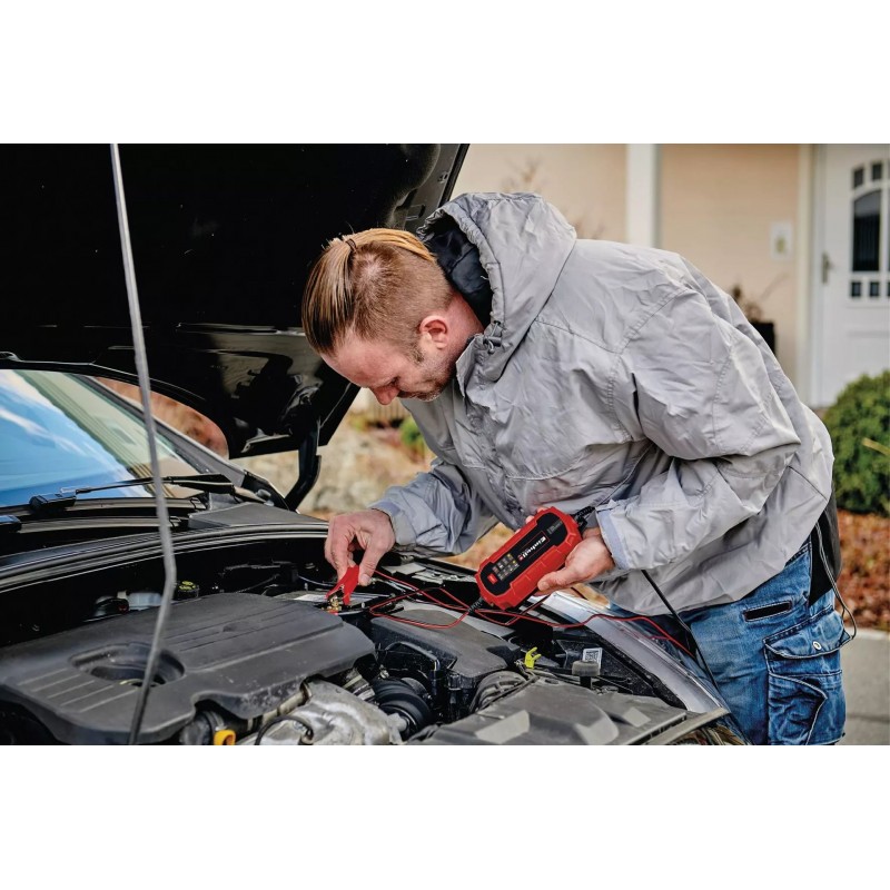 LED indikátor napätia a priebehu nabíjania poskytuje okamžitý prehľad o stave batérie a aktuálnom režime nabíjania. Zariadenie zobrazuje úrovne nabitia 25 %, 50 %, 75 % a 100 %, režim 12 V a „zimný režim“. Na možné problémy upozorní varovná kontrolka. Vďaka plne izolovaným svorkám možno nabíjačku Einhell pripojiť bezpečne a jednoducho. Kryt je vybavený závesným okom pre montáž na stenu.