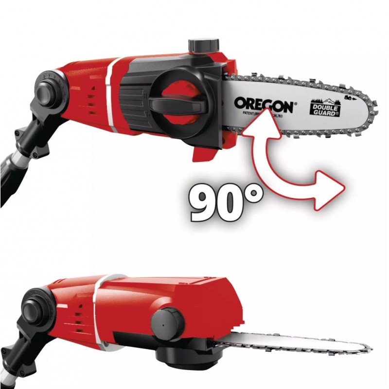 Nástavec pre prerezávaciu akumulátorovú pílu Einhell GE-HH 18/45 Li T dosahuje rýchlosť rezu 3,76 m/s a je vybavený vysokokvalitnou lištou a reťazou značky OREGON. Vďaka otočnému nástavcu v rozsahu 90° je možné jednoducho vykonávať vodorovné rezy.