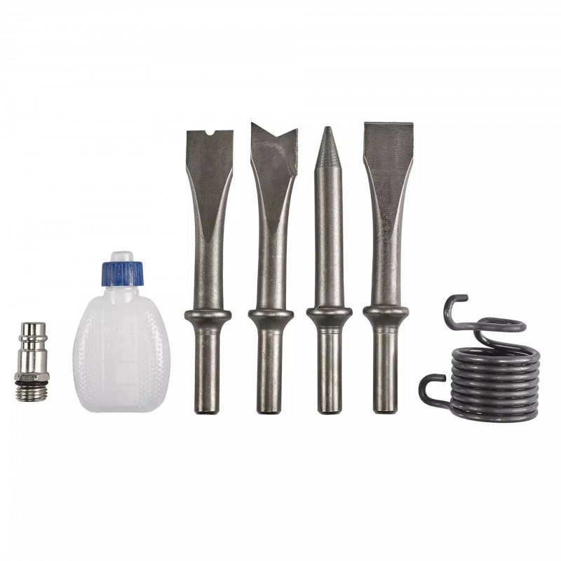 Sada príslušenstva k Einhell TC-PC 45 so štyrmi sekáčmi, upínacou pružinou, olejničkou a vsuvkou na bielom pozadí.