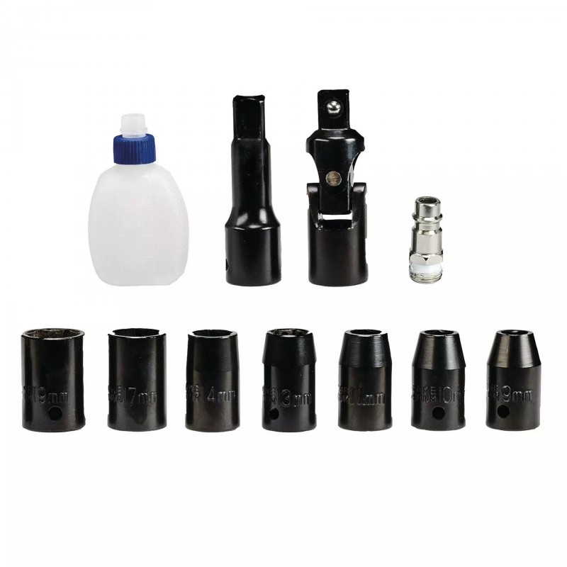 Račňový uťahovák sa dodáva so 7 nástrčnými kľúčmi (9/10/11/13/14/17/19 mm) a ďalším príslušenstvom v praktickom kufríku.