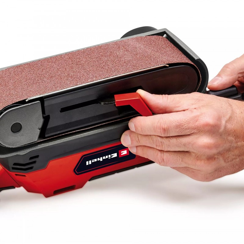 Na stacionárne použitie je pásová brúska vybavená integrovaným odkladacím priestorom a dvomi skrutkovými svorkami na upevnenie, ktoré sú súčasťou balenia. Pracovisko zostáva vždy čisté vďaka integrovanému odsávaniu prachu so zberným vakom alebo pripojeniu vysávača na mokré a suché vysávanie Einhell. Okrem skrutkových svoriek sú v balení dodávané aj tri brúsne pásy 533 × 75 mm (P80).