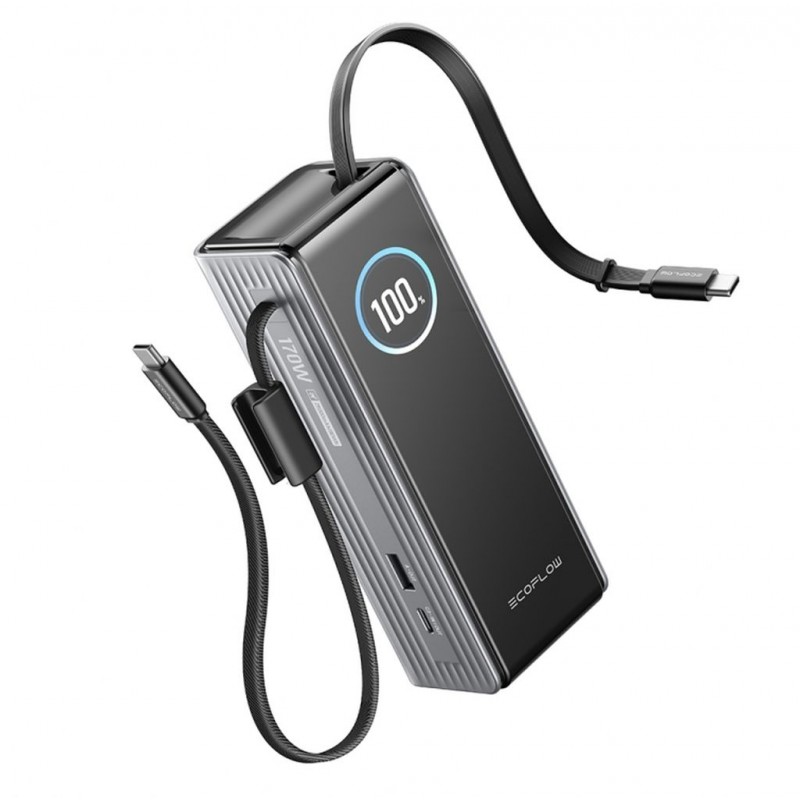 EcoFlow RAPID Power Bank s kapacitou 25 000 mAh, powerbanka s maximálnym výkonom 170 W. Disponuje inteligentným rozdelením energie až pre štyri zariadenia súčasne. Jej aktuálne prevádzkové podmienky je možné priebežne sledovať na TFT displeji. Originálna technológia X-Guard nepretržite monitoruje celý proces nabíjania a zabezpečuje tak bezpečnú a stabilnú prevádzku. Powerbanka sa dokáže nabiť na 50 % za iba 26 minút. Disponuje zasúvateľným 67 cm USB-C (100 W) káblom a 26 cm USB-C (100 W) káblom s pútkom.
