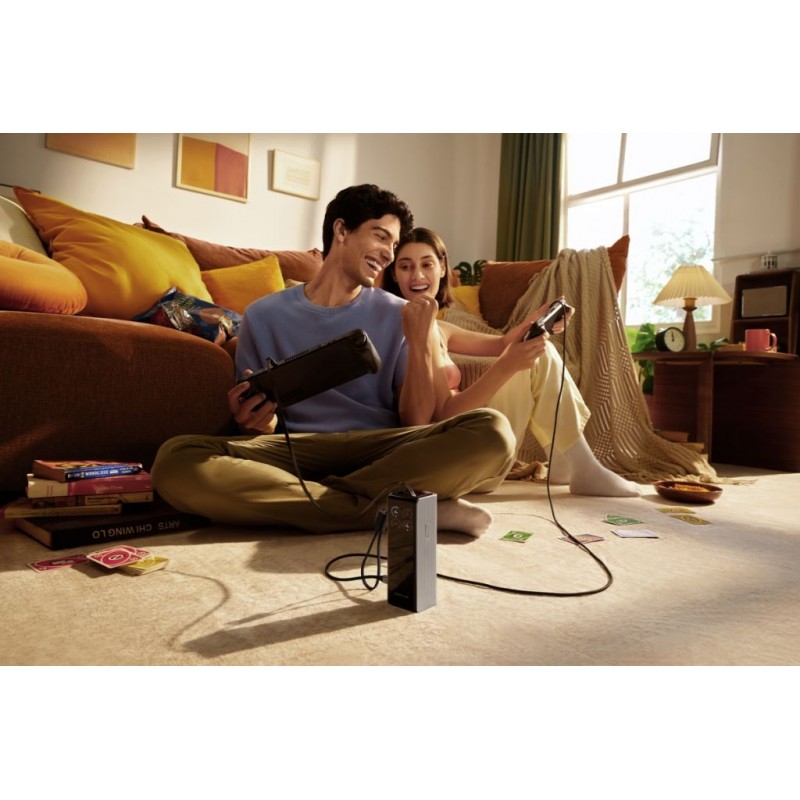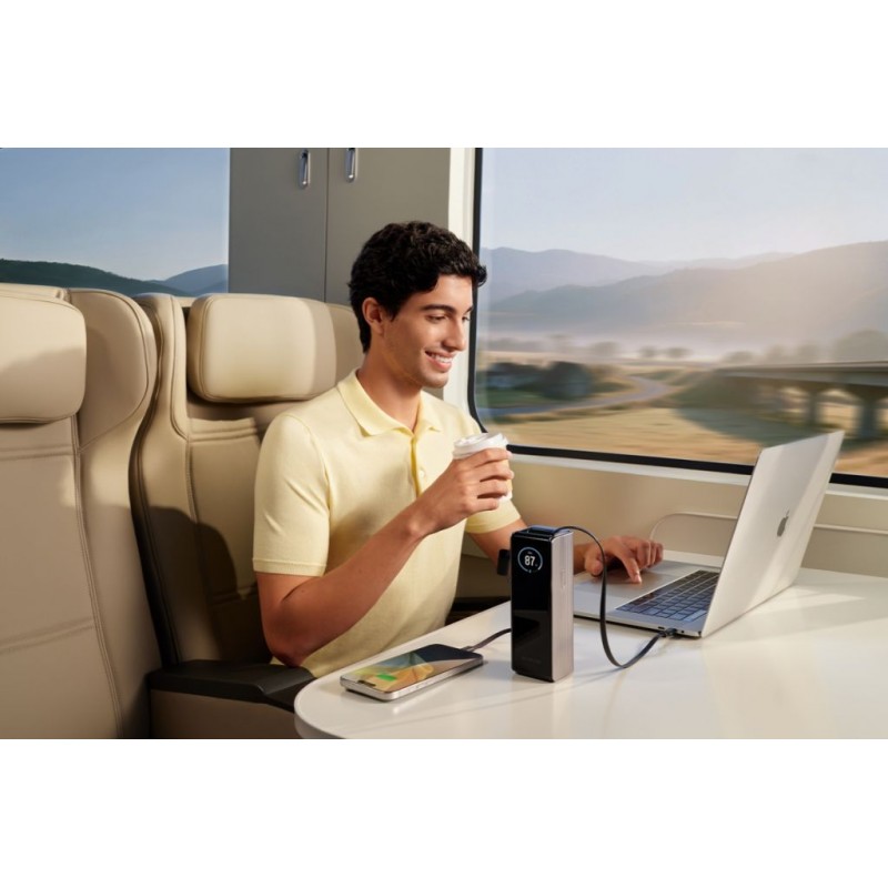 Žiadne stratené káble – dva integrované 100 W USB-C káble s navíjacím mechanizmom a pútkom sú vždy poruke, úhľadne uložené v elegantnom dizajne powerbanky. Navíjací mechanizmus umožňuje prístup k napájaniu v priebehu niekoľkých sekúnd.