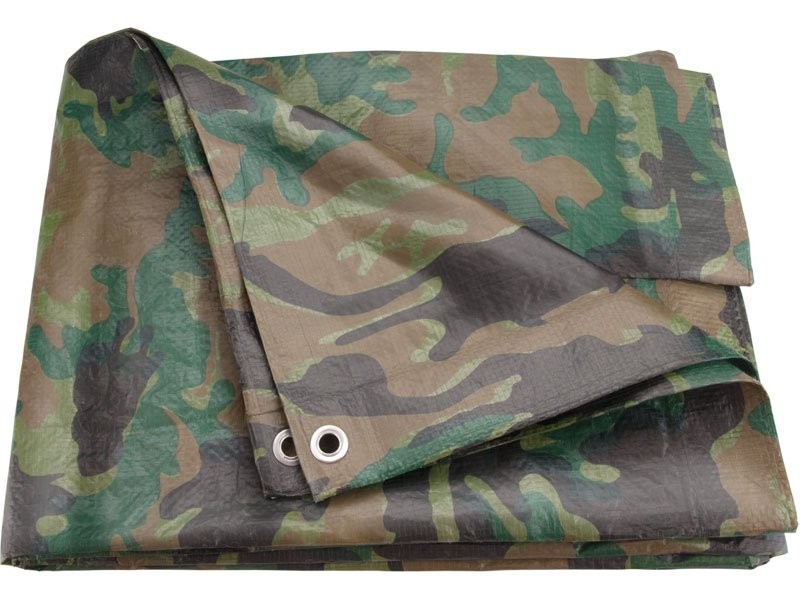 Zosilnená PE krycia plachta s kamuflážnymi vzorom so zvýšenou odolnosťou proti UV žiareniu a poveternostným vplyvom, s obojstrannou lamináciou a zosilnenými okrajmi.