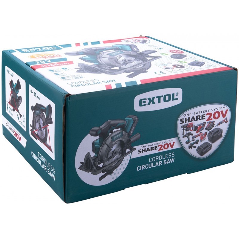 Brushless kotúčová píla je navrhnutá tak, aby užívateľom poskytla výkonné a ľahké rezanie pri rôznych inštalatérskych, elektrických, rámovacích, dokončovacích a tesárskych prácach. Píla je poháňaná najmodernejším "brushless" motorom s 3650 ot./min umožňuje používateľom rýchlo a ľahko rezať tvrdým materiálom. Tento nový typ motora má vyššiu životnosť, je výkonnejší a má menšiu spotrebu el. Energie ako klasické motory s uhlíkovými kefami. Horná a spodná kovový ochranný kryt poskytujú vynikajúcu ochranu kotúča pri páde. Gumová mäkká rukoväť je ergonomicky navrhnutá tak, aby užívateľom poskytovala vynikajúce pohodlie a vyváženie pre ľahko ovládateľné rezy. pre bežnú prácu postačujú jeden alebo dva 2000mAh akumulátory, ktoré môžete rýchlo nabiť v rýchlonabíjačke, pre náročnejších alebo dlhšej práci odporúčame väčšie akumulátory s kapacitou 4000mAh. akumulátor možno použiť vo všetkých typoch náradia radu EXTOL SHARE20V. Vďaka použitej Li-ion technológii je ho možné kedykoľvek dobíjať, bez toho aby sa tým znižovala jeho kapacita. Li-ion akumulátor stráca energiu vplyvom samovybíjania veľmi pomaly a vydrží dlho nabitý a pripravený na použitie.